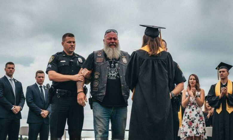 He held me close, his big, calloused hands trembling as they stroked my hair, careful not to knock off the cap I’d worn for the ceremony. His face was wet, but I didn’t notice—my tears soaked into his leather, into his soul.
