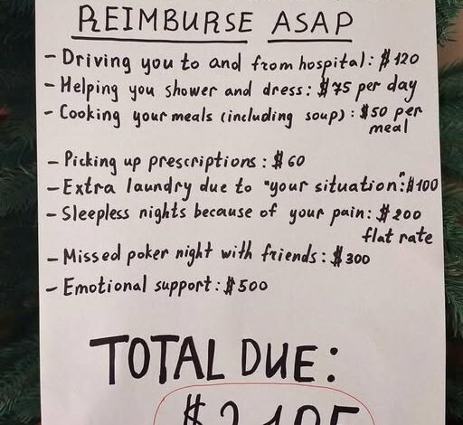 The list was a cold, calculated autopsy of their recent days. Daniel had billed her $120 for driving her to the hospital. He had charged $75 a day for helping her shower and $50 per meal for cooking basic soup. He even included a $300 surcharge for a “missed poker night” and, most devastatingly, a $500 fee for “emotional support and reassurance.” The total due, circled in red like a delinquent utility bill, was $2,105.