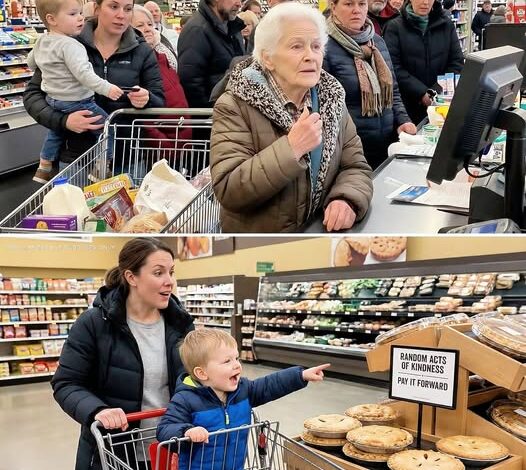 Ahead of us stood an elderly woman with silver hair wound into a neat bun, the kind that said she’d lived through harder times than mine. Her cart held the basics—milk, potatoes, a can of soup, bread—and one treat: a small apple pie, golden under its crinkled package.