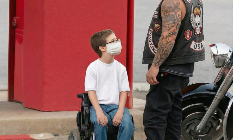 The biker heard him. Turned around. Saw my little boy in his wheelchair with his mask on, staring at the motorcycle like it was made of gold.